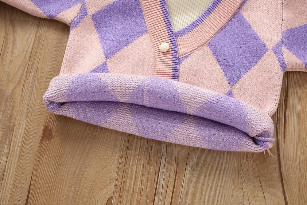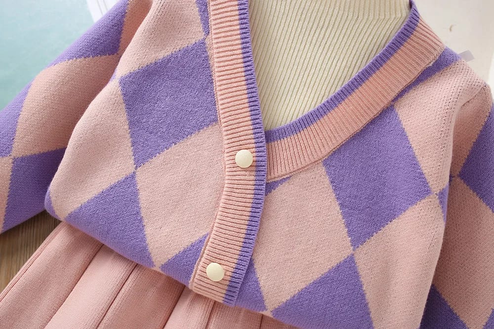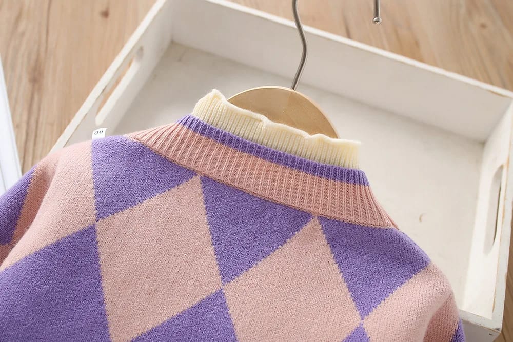Miniklerin kış ve sonbahar stiline sofistike bir dokunuş katacak bu Argyle desenli örgü takım, zamansız bir şıklık sunuyor. Takım, V yaka hırka ve pileli mini etekten oluşmaktadır. Hırka, klasik baklava desenleriyle dikkat çekerken, içindeki balıkçı yaka triko bluz (veya bluz görünümlü yaka detayı) ile katmanlı ve zengin bir görünüm sağlıyor. Yüksek kaliteli triko ipliği sayesinde hem sıcak tutan hem de konfor sunan bu set, özel günler, okul etkinlikleri veya günlük şıklık için kusursuz bir tercihtir.